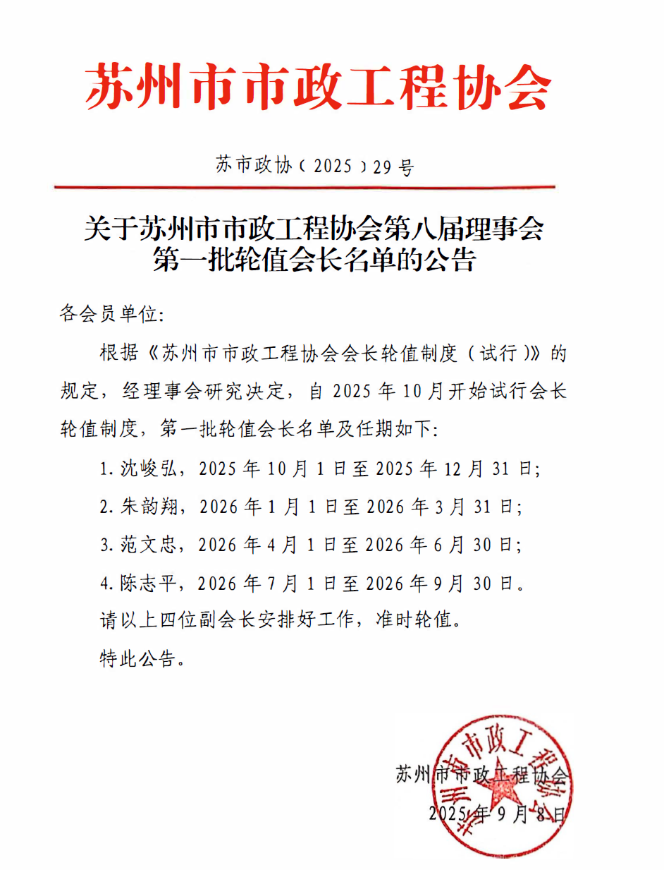 关于苏州市市政工程协会第八届理事会第一批轮值会长名单的公告