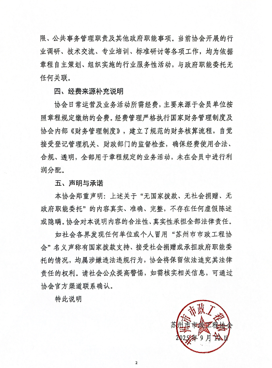 关于苏州市市政工程协会无国家拨款、无社会捐赠无政府职能委托的说明